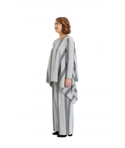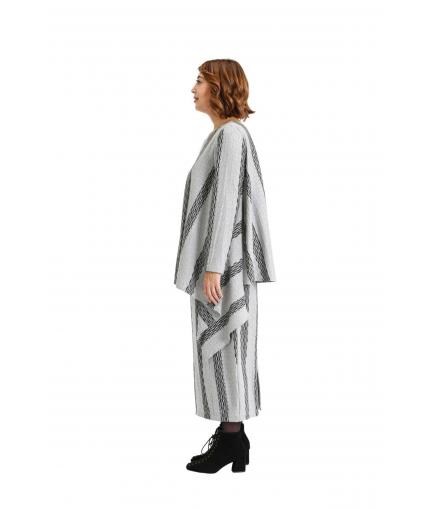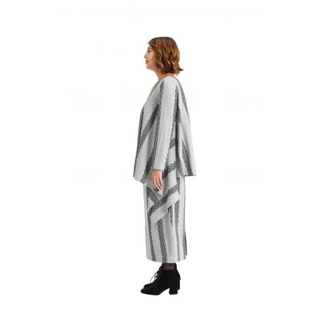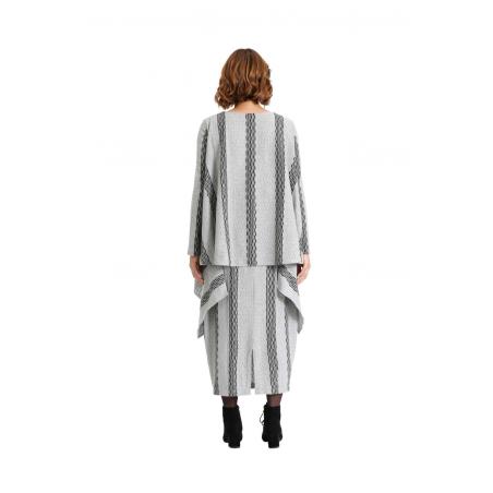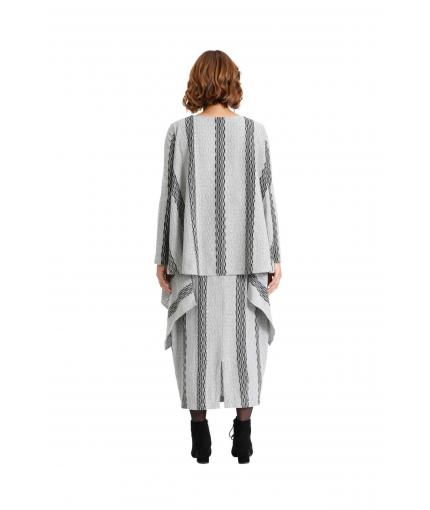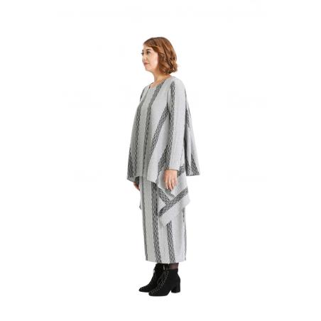 Relaxed fit top with an asymmetric hem. Longer tiers on sides and black stripe pattern give the top an eclectic look. Long sleeves, round neck and an underlay of the same material. Wear with matching Grey and black drawstring knit trousers BM19FW255 or Grey and black knit skirt BM19FW230. For another look wear with BM19SS060 Black jersey drawstring pant.