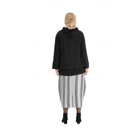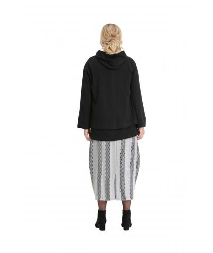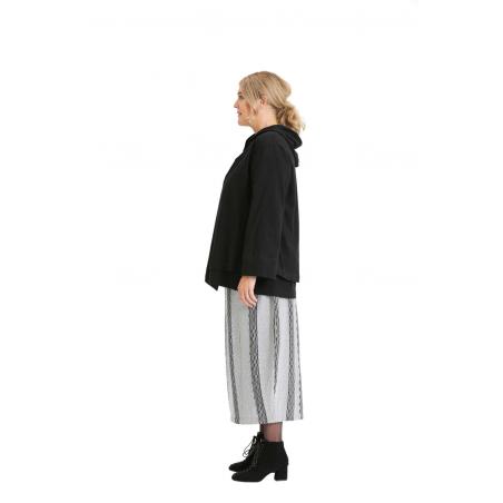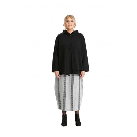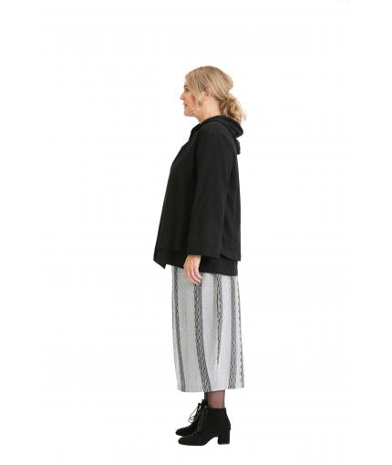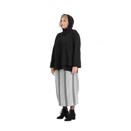 The combination of comfort and original details make this relaxed fit A-line hooded jacket a special piece. Single button closing at the neck and an angled hem in the front draw the attention. Featuring a hood and a front pouch pocket that underline a casual look. Wear as an overlay with the A-line black knit top TP19FW190 the grey and Grey and black drawstring knit trousers BM19FW255 or Grey and black knit skirt BM19FW230. You can also combine it with BM19SS060 Black jersey drawstring pant.